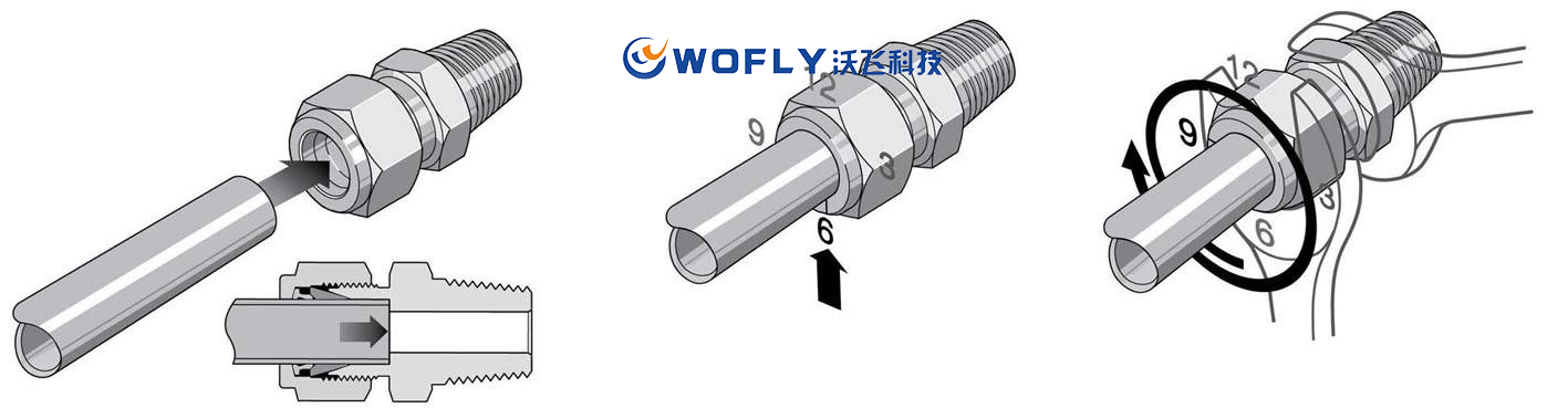如圖所示,下面這就是卡套式管接頭,卡套式管接頭具有結(jié)構(gòu)簡(jiǎn)單、使用方便和不用焊接等優(yōu)點(diǎn),在化工,制藥,石油,科學(xué)實(shí)驗(yàn),電氣工程等諸多行業(yè)中廣泛應(yīng)用,通過(guò)外表觀察可以發(fā)現(xiàn),卡套式管接頭由三部分組成:接頭體、卡套、螺母。安裝方法非常簡(jiǎn)單,當(dāng)卡套和螺母套在鋼管上插入接頭體后,旋緊螺母時(shí),卡套前端外側(cè)與接頭體錐面貼合,內(nèi)刃均勻地咬入無(wú)縫鋼管,形成有效密封。但是我們?cè)诎惭b的時(shí)候需要注意一些事項(xiàng),沃飛科技小編為您介紹一下卡套式接頭如何安裝及安裝注意事項(xiàng)。