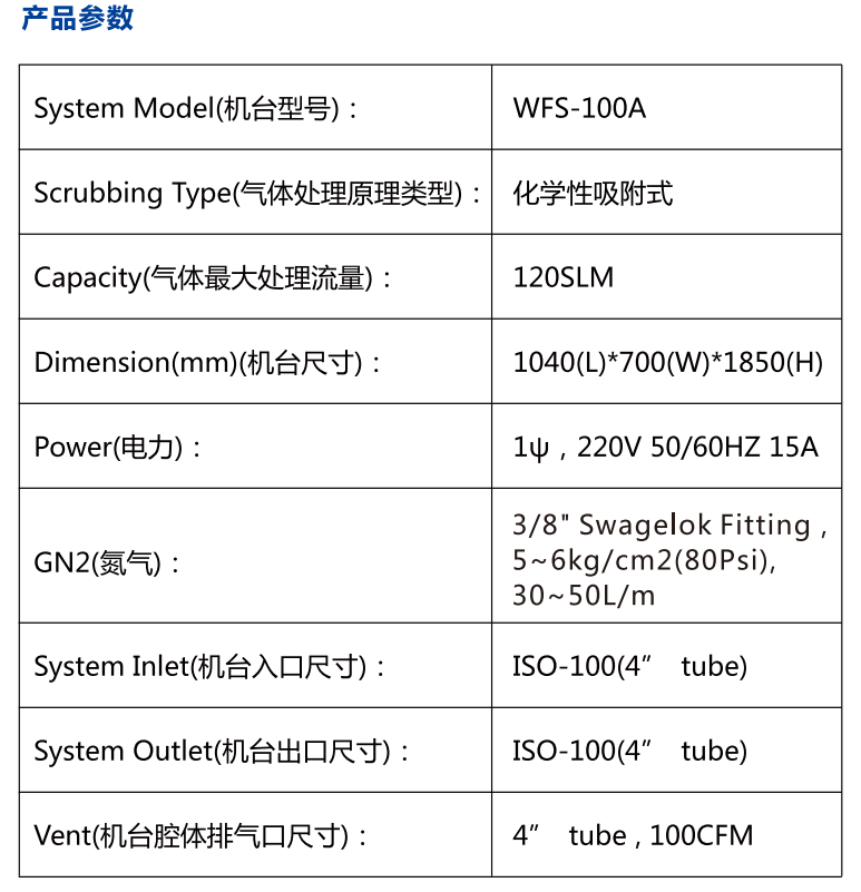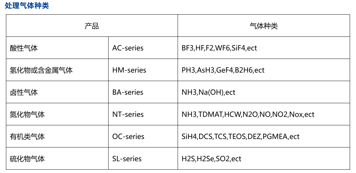 WFS-100F吸附式local scrubber 尾氣處理設(shè)備可處理氣體種類包括半導(dǎo)體、液晶以及太陽(yáng)能等行業(yè)中蝕刻制程與化學(xué)氣相沉積制程中使用的特氣,主要包括SiH4、SiH2Cl2、PH3、B2H6、TEOS、H2、CO、NF3、SF6、C2F6、WF6、NH3、N2O等。